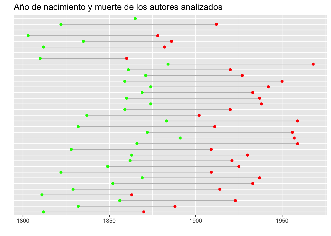 No es el gráfico más lindo del mundo, pero sirve para tener una idea del rango temporal de las novelas que vamos a analizar. Vemos por ejemplo que la amplia mayoría, salvo cinco excepciones, murieron antes de 1950, y ninguno llega a los 2000. Sería interesante incorporar al gráfico, por ejemplo con un punto negro, el momento en el que escribieron la novela que vamos a analizar, pero lamentablemente esa información no está en las bases. Se podría buscar, sí, pero por ahora me voy a limitar a lo que tenemos.