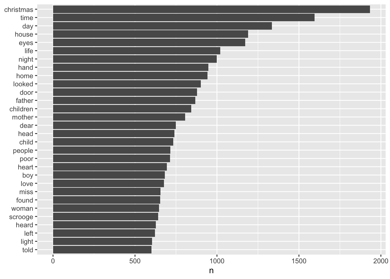 Que “christmas” (navidad) sea la palabra más frecuente no debería sorprendernos, ya que el dataset contiene justamente libros sobre la Navidad. Esto puede parecer una obviedad, pero a veces ocurre que nos enfrascamos mucho en un análisis y nos olvidamos por ejemplo los criterios utilizados en la selección o recolección de datos. La segunda y la tercera palabra (“time”, tiempo y “day”, día) posiblemente estén relacionadas también con la Navidad, ya que “Christmas day” y “Christmas time” funcionan como collocations.